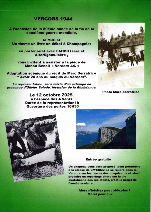 L’exposition itinérante de l’association des Pionniers du Vercors sera présentée à l’espace des 4 Vents ce dimanche 12 octobre – une expo en six panneaux qui retrace l’histoire du maquis du Vercors – et restera ensuite visible à la mairie. À la bibliothèque, des ouvrages sur la résistance feront l’objet d’une promotion particulière.