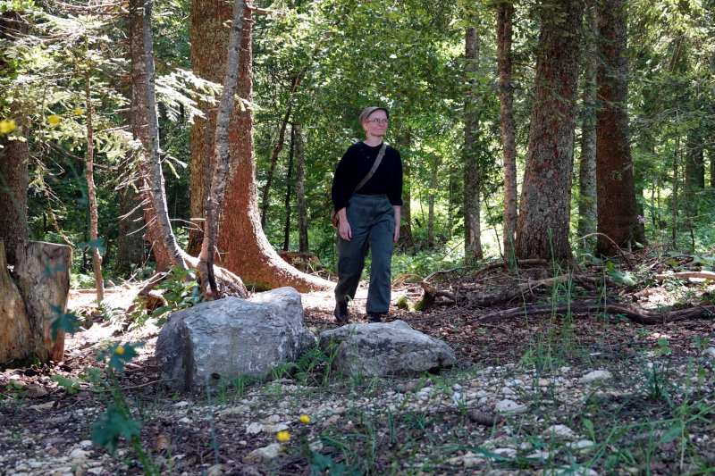Manon Benoit, lors de la visite-spectacle au refuge de Gève. La visite est organisée en coopération avec Blandine DamieuxVerdeau, guide conférencière. Été 2024.