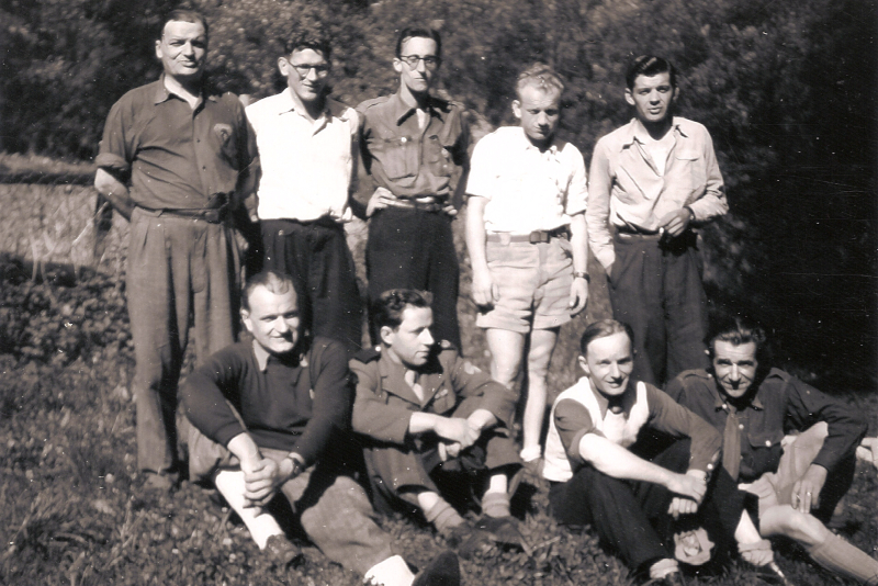 Groupe de maquisards du C3 au printemps 1944. Au fond, de gauche à droite, debout : Charlot, Citroën, Crainquebille (Serratrice), Dufour, Dédé. Accroupis au premier rang : Fend-la-Bise, Lucien en uniforme, Guiboud, alias Sully et Jojo.